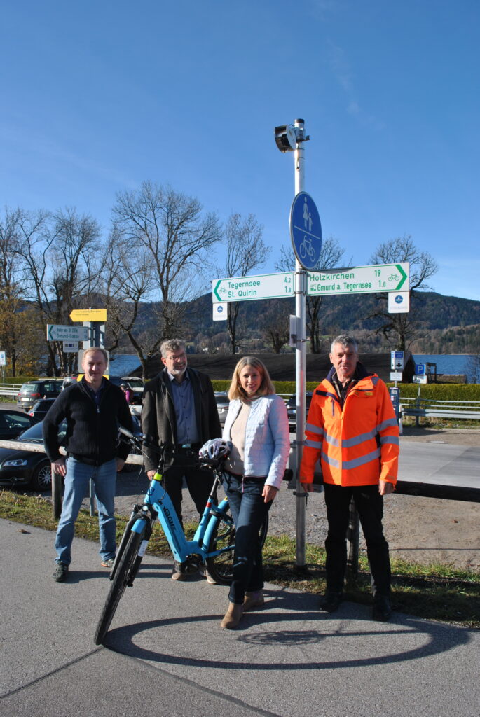 (v.l.n.r) Wolfgang Dagner vom Straßenverkehrsamt, Erster Bürgermeister Alfons Besel, Radverkehrsbeauftragte Veronika Simon und Techniker Josef Harraßer bei der offiziellen Inbetriebnahme der Zählstelle. ©  Foto: M. Glas, Gde. Gmund a. Tegernsee