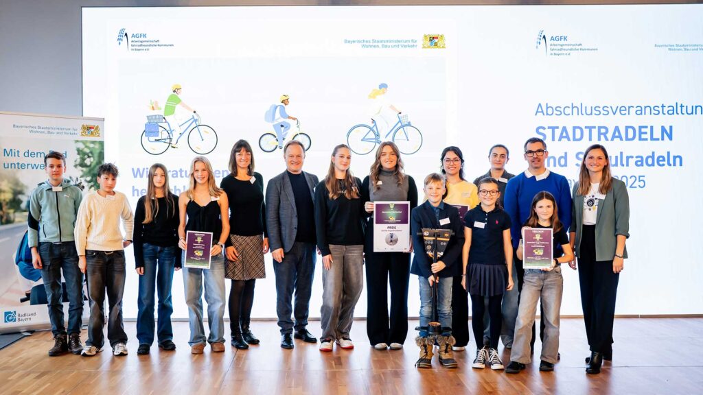 26. November 2025 – Im Rahmen der feierlichen Abschlussveranstaltung STADTRADELN und Schulradeln am 24. November im Literaturhaus München wurden auch die drei Erstplatzierten des Kreativ-Wettbewerbs prämiert, den die AGFK Bayern 2025 erstmals begleitend zum Schulradeln in Bayern ausgelobt hatte. Schülerinnen und Schüler aus elf bayerischen Schulen hatten sich beteiligt.